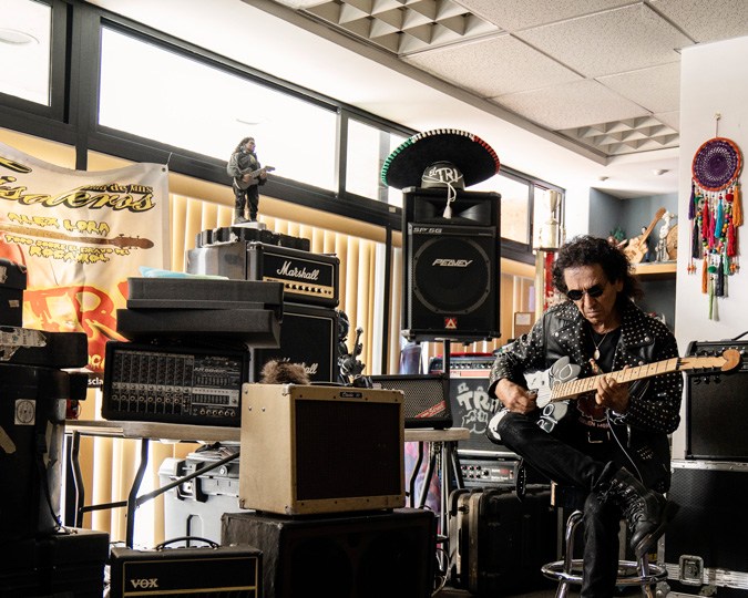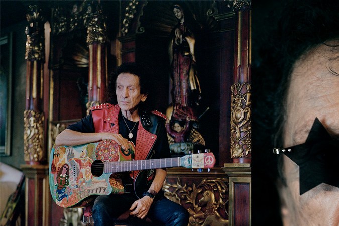In an unassuming property on Periferico on the South Side of Mexico City lies a house that functions as headquarters to a man and his band who have come to define rock n’ roll music in this country. Here, the 69-year-old legend sits in leather pants, boots, a black t-shirt with an image of la Virgin Guadalupe, and a black denim jacket decorated with patches of his band. He’s surrounded by posters, gold record plaques, and other memorabilia from more than 50 years playing rock music. As we settle for our interview, Alex Lora picks up a guitar and starts playing a blues shuffle, the kind of rhythmic riff that has been the backbone of his career—with Three Souls In My Mind, later renamed El Tri–for more than half a century.