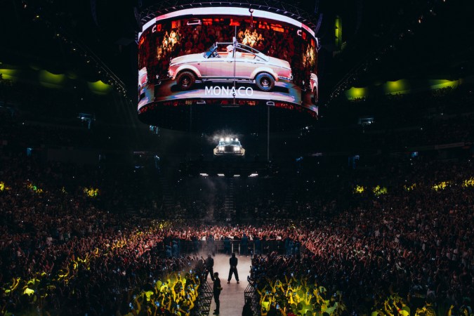 “Monaco” begins, and Bad Bunny descends from inside the jumbotron and into the middle of the arena in a 1970 Rolls Royce Shadow, wearing a black mask with red eye covers. The camera pans above him to show that he’s got the aux cord, and we’re seemingly listening to the album straight from his phone. The tracks unfold, leaving no doubt that the Bad Bunny we championed has returned.