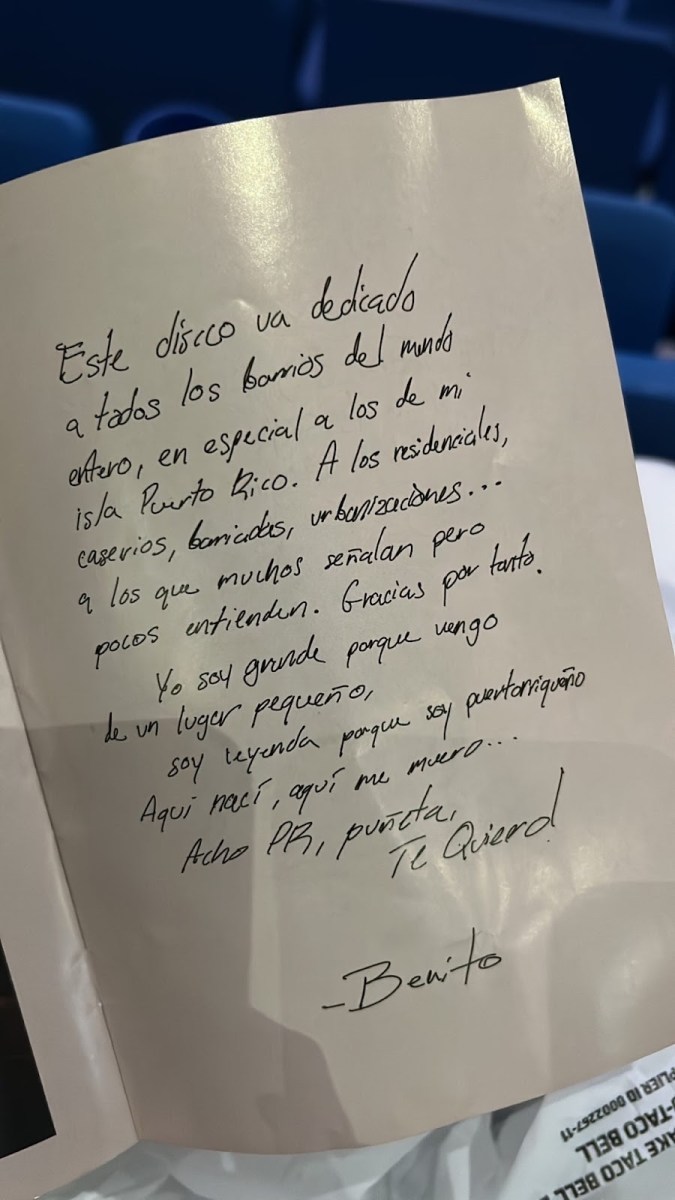 On the big release day (October 13), fans began gathering at the Coliseo de Puerto Rico, and as they waited in line, his team handed out booklets to all attendees. On the front page, it read “Acho PR, puñeta, te quiero.” Inside were pictures of him shaving his head and working in the studio with Tainy, De La Ghetto, Ñengo Flow, and Arcángel. Nestled within the pages was also a handwritten note that said: