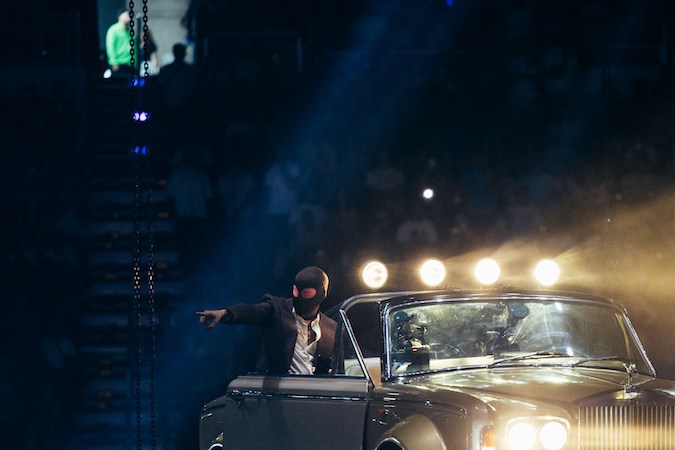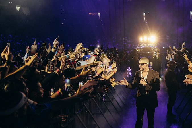“Monaco” begins, and Bad Bunny descends from inside the jumbotron and into the middle of the arena in a 1970 Rolls Royce Shadow, wearing a black mask with red eye covers. The camera pans above him to show that he’s got the aux cord, and we’re seemingly listening to the album straight from his phone. The tracks unfold, leaving no doubt that the Bad Bunny we championed has returned.