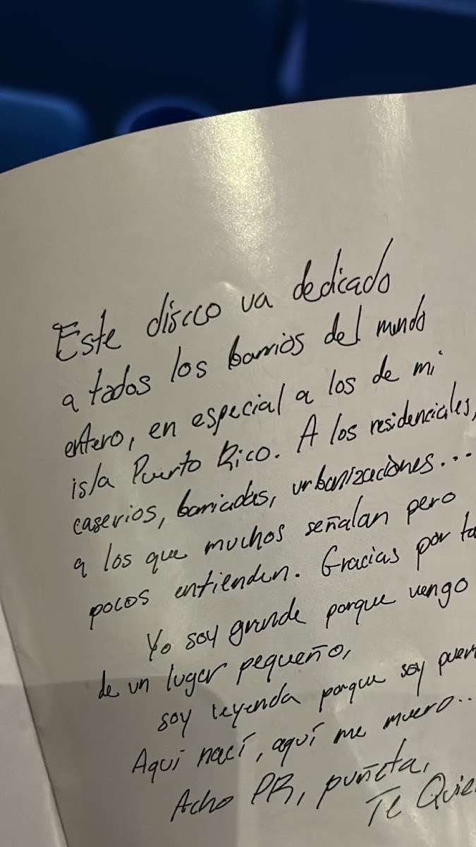 On the big release day (October 13), fans began gathering at the Coliseo de Puerto Rico, and as they waited in line, his team handed out booklets to all attendees. On the front page, it read “Acho PR, puñeta, te quiero.” Inside were pictures of him shaving his head and working in the studio with Tainy, De La Ghetto, Ñengo Flow, and Arcángel. Nestled within the pages was also a handwritten note that said: