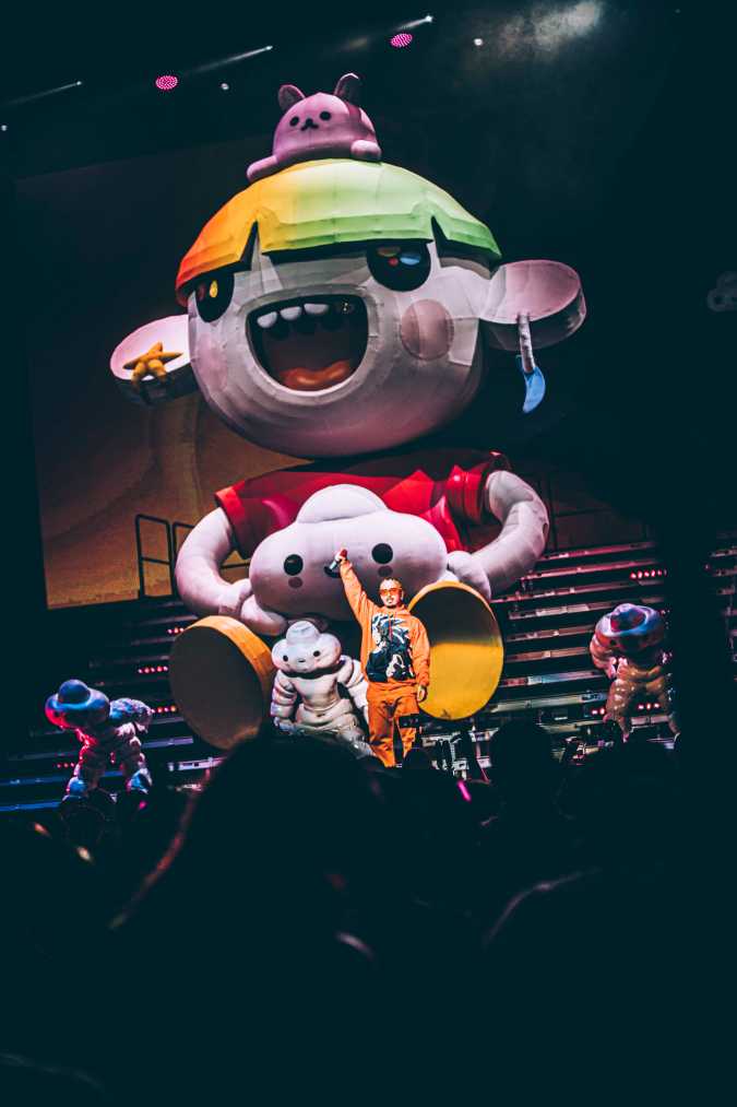 Kicking off with “Reggaeton,” Bavlin, fitted in a neon-orange sweatsuit complementing his neon, black-striped buzzcut, was all smiles in response to the audience’s booming welcome. The oversized silhouette now revealed to be a yellow, bowl-cut donning character with a bunny (or a kitten, or a combination?) resting on its head, with a smiling cloud nestled below, sat atop bleachers from which costumed dancers – yellow creations with heads like a DEVO energy domes – descended in uniform choreo.