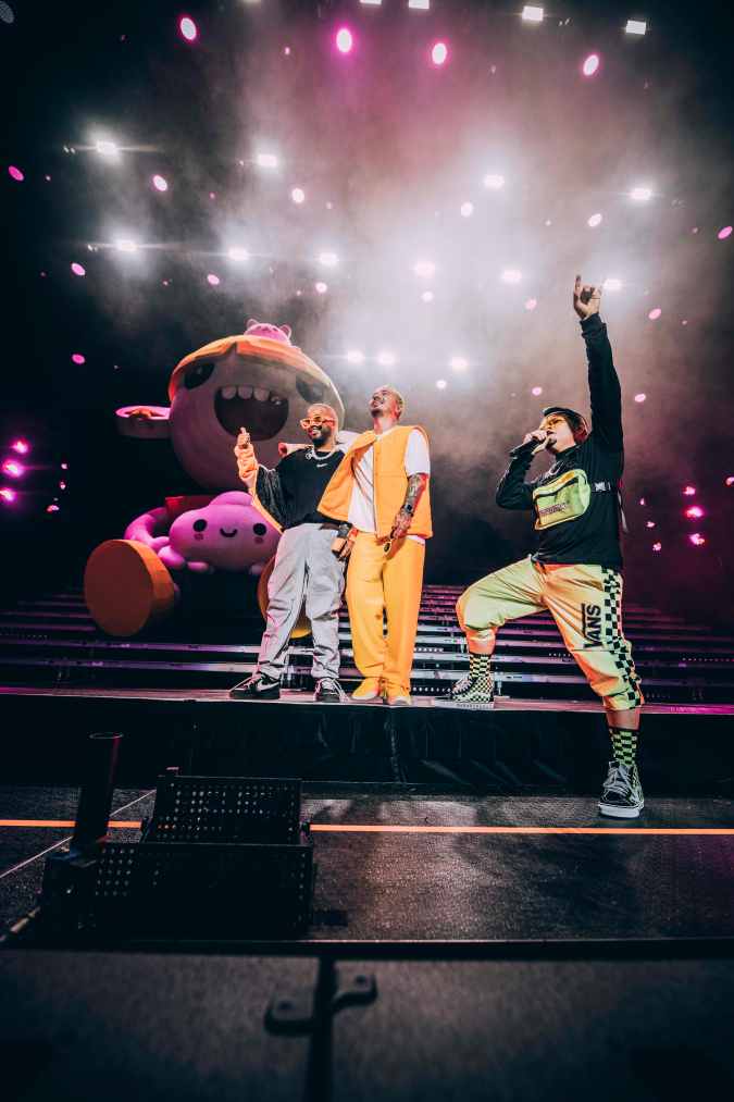 A reminder that everyone was really just calentando motores for Balvin, though, came in the curtains that backdropped both openers: You could see hints of the stage display to come in the silhouette of what seemed to be a supersized figurines of Friends with You, the LA collective with whom he’s been collaborating with on promo.