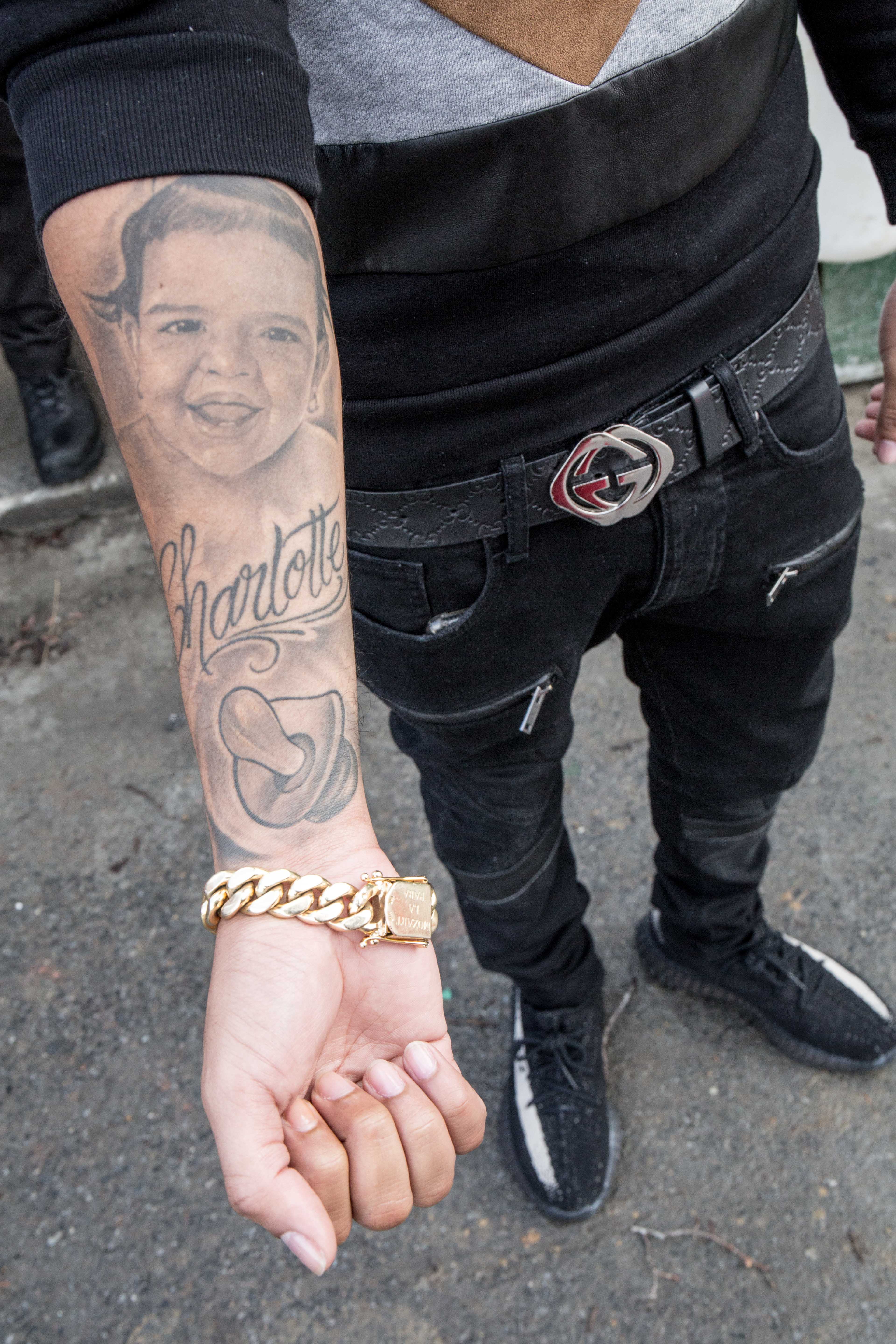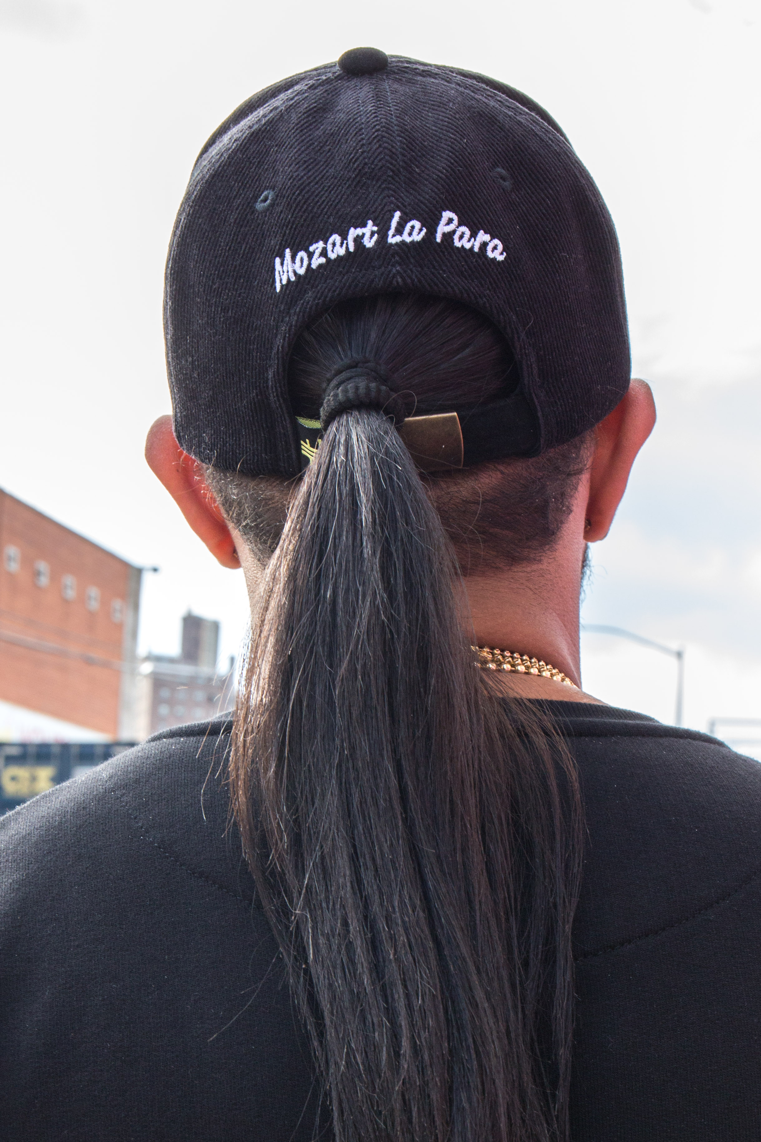 Everything about Mozart la Para is immaculate. His textured black skinny jeans sit right below his hips, tethered by a shiny Gucci belt. His luxurious mane, which he’s worn in braids and a distinguished bun in the past, sits in a neat, straight ponytail under a corduroy dad cap embroidered with his likeness. Three gold chains lay on his chest, playing tag with the symmetrical lines on his sweater. He is 20 minutes early.