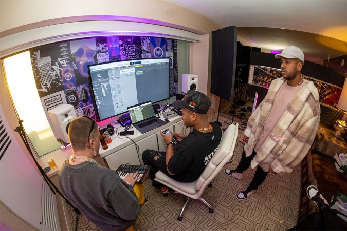 Along with the talent that walked through Remezcla Studios, the event also featured a recording studio set up for unexpected collabs and interactions — a space that had producer Caleb Calloway on hand to create some new sounds and set the tone for emerging and established Latine musicians to collaborate. And that wasn’t all, if attendees wanted to take their creativity from sound to fashion: PUMA partnered with Major Wavezz to offer customized shoes to top artists in their designer studio that featured the Vegas skyline as their background. It was no surprise to see the artists bring their A-game when it came to designing their customized shoes.