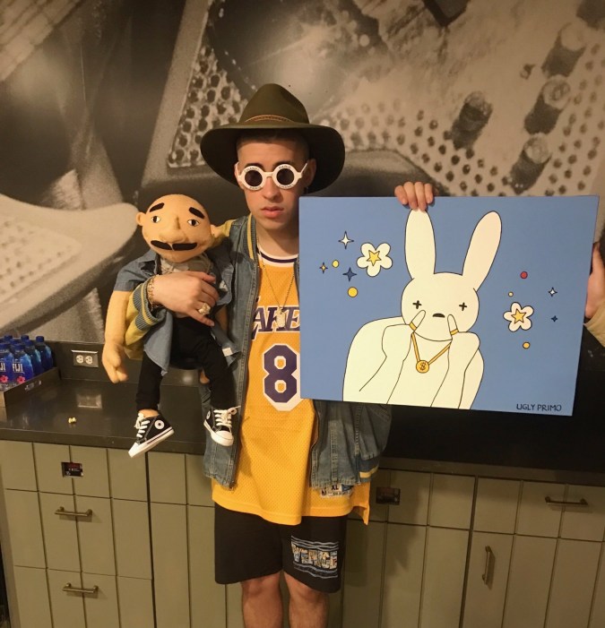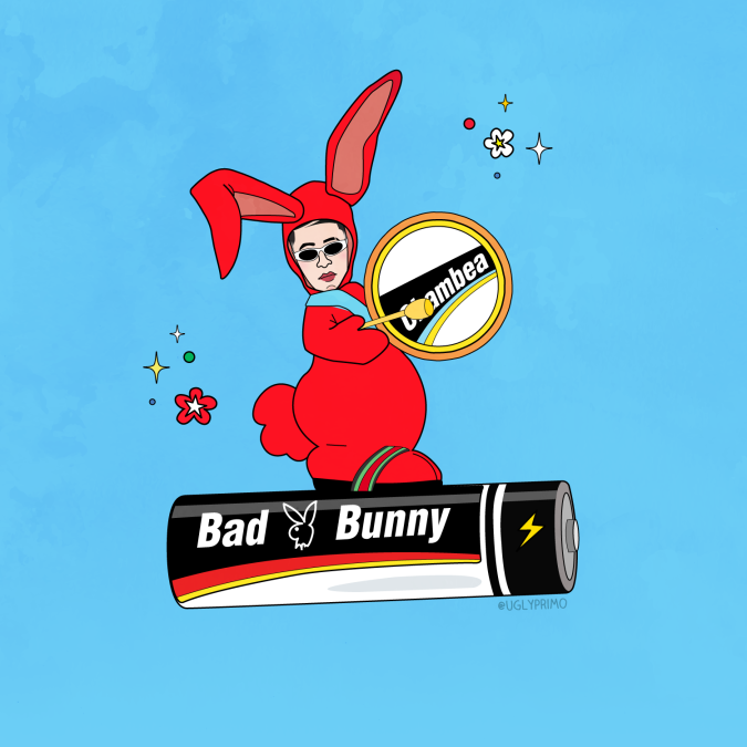 If you’ve spent any time on Instagram lately, chances are you’ve seen the name Ugly Primo come across your timeline. Within three weeks of starting his Instagram account, the young artist (who wishes to remain anonymous) had already launched a collaboration with Bad Bunny. The fourth post on the profile featured the Puerto Rican rapper reimagined as the Energizer Bunny, sporting Gucci flip-flops and banging on a drum with the word “Chambea.” It quickly caught the eye of Benito Martínez Ocasio himself, and led Ugly Primo to design official merch and clothing for the Latin trap superstar.