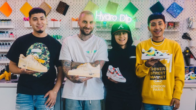 Their personalized sneaker pieces are near completion, and we want to know more about what each one represents to them. Yahritza references she was “just having fun with it” and drew inspiration from street artists like KAWS, and expressions of things important to her, like trendy catchphrases and even titles of her songs. And then there was a “The future is female” patch, rightfully placed on the heel for those following her footsteps closely to take inspiration from. Jairo dives into his love for the aesthetic of dunks for his creation. His final product displays a neon cow print that included personal touches like patches of an evil eye design and a cherry on the other. Mando took a more traditional approach, deeply inspired by a shoe he loved — the Off-White 4’s, which he wanted to replicate.