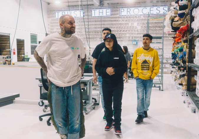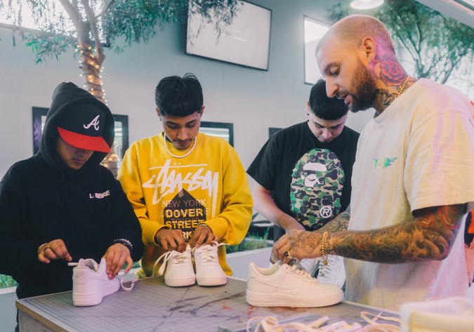 At the sneaker studio, the group works attentively with Ciambrone to create their best work. Their creative process becomes blatant throughout the activity. Yahritza checks in with Adriana to figure out what shoelace color is best. Jairo asks Mando for help in finishing his bright yellow drip design on his Nike logo. David Gonzales with Lumbre shares input on colors and fabric, as their publicist Ximena Acosta shares laughs with the parents as they proudly overlook their children’s experience. Their family dynamic, even with the development of their career, shines through first and foremost in everything they do. “He’s so concentrated. He’s always been like that,” their mom, Rosa Martinez, shares about Jairo’s hawkeye concentration. “He’s even like that in school. How wonderful to see them doing things they’re clearly excited about and love.”