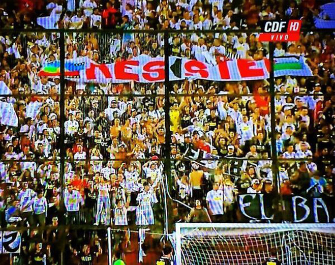 In talking to a wide range of people in Chile, however, I found that the most intriguing aspect of the jersey scandal has been the reaction of those without ethnic or religious connections to the conflict. Perhaps most stunning was the reaction within the Chilean premiere league. Shortly after the eruption of the controversy early in the new year, Palestino faced off against two of the most formidable teams with the largest fan bases in Chilean soccer, Colo-Colo and Universidad de Chile. During both of these matches the “Barra” or “hinchas” (hardcore fans) of Colo-Colo and U de Chile made public displays of solidarity with Palestino and the Palestinian people . Universidad de Chile’s home fans held up a banner with the Palestinian flag that read “Palestina Libre” (Free Palestine), while Colo-Colo supporters unfurled an enormous banner behind their goal which featured the Palestinian flag on one end, the Mapuche flag on the other, and the map of historic Palestine filling in for the letter “i” in the word “Resiste” (resist) printed in bold in the center.