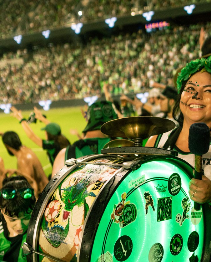 The first thing that Clarke told us was that La Murga de Austin, an all-volunteer, Latin America-style brass band, originated around a group of people’s desire for community, and of course, a love of futbol — which, in our communities, is no casual thing. So, for Clarke, when it was announced that Austin was getting its own MLS team, it was time to plan. “A couple of us at the beginning were like, okay, what is this gonna look like?” or, “Who are we gonna take inspiration from?”