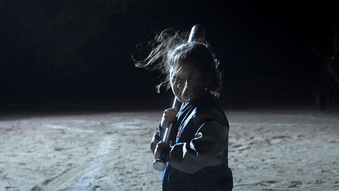 In this imagined not-so-distant future world (think Children of Men but in Sonora), women are a disappearing species. That’s why our young protagonist, Huck (played by Matilde Hernandez, the director’s own daughter) wears a mask. If the armed guys who employ her dad to keep up a baseball field ever found out she’s a girl, she’d surely be taken away. That’s what happened to her older sister and her mother.