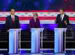 Julian Castro, Sen. Cory Booker and Sen. Elizabeth Warren and Beto O'Rourke speaks during the first night of the Democratic presidential debate on June 26, 2019 in Miami, Florida. Photo by Joe Raedle/Getty Images