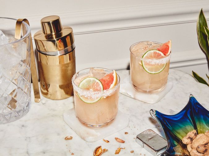 - Rub a bit of grapefruit and salt on one side of the glass you’ll use for the cocktail