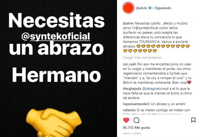 In a now-deleted Instagram post, J Balvin replied to Syntek. “You need care, affection, and a lot of love! @syntekoficial as a Latino, please don’t fight, just accept differences. Elevate your conscience [to] what we call tolerance,” wrote the Colombian star after calling on his fans to “send him hugs.”