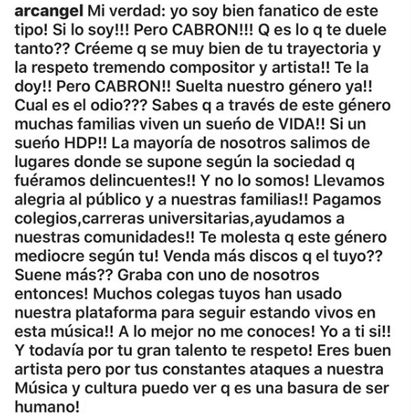 In a lengthy Instagram post, Arcángel, who explained that he is an Aleks Syntek fan, asked the Mexican singer to leave reggaeton alone. “Do you know that through this genre many families live their dream lives?…Most of us come from places where, according to society, we are supposed to be criminals! And we’re not! We bring joy to our fans and our families,” he wrote. The post has since been deleted.