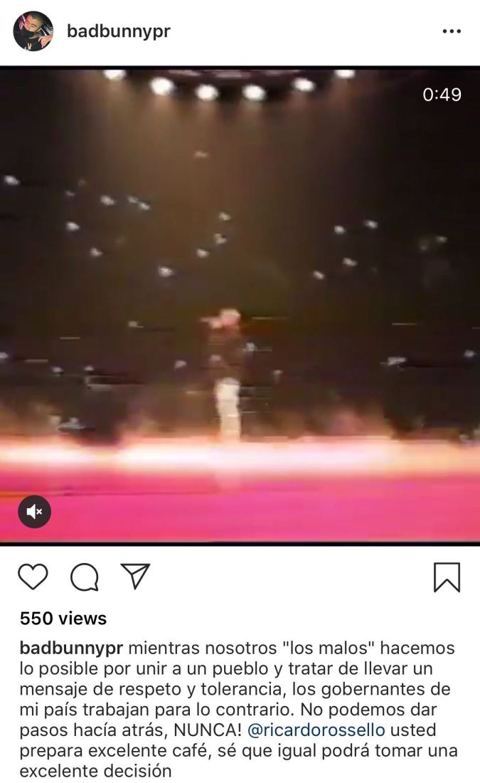 “While we ‘bad guys’ do our best to unite people and spread a message of respect and tolerance, the rulers of my country do the opposite. We can’t take steps backwards, NEVER! @ricardorossello you prepare excellent coffee, I know that you can still make an excellent decision,” Bad Bunny wrote on Instagram, likely referring to the meeting in Rosselló’s office not too long ago.