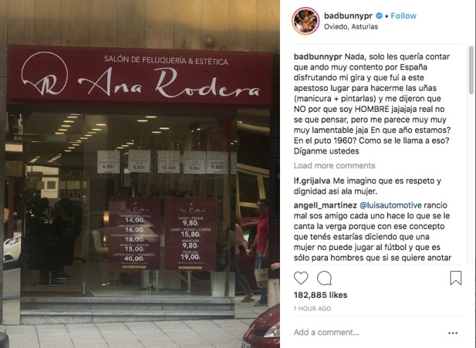 Metro PR reports that the owner of the business attempted to clarify the incident in a radio interview. According to the local newspaper, La Mega host Fernán Vélez spoke to the owner of the beauty salon, who told the station that the business isn’t unisex and that it only serves women. Vélez claims the salon also directed Bad Bunny to another business where could get his nails done.