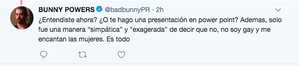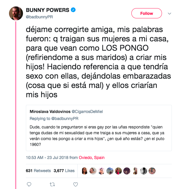 El Conejo Malo replied to the fan on Twitter, attempting to clarify his statement and admit that part of his response was wrong. “I was saying that I’d have sex with their wives, get them pregnant (which is wrong) and the men would raise my kids,” he wrote, adding, “It was only a nice and exaggerated way of saying, no, I’m not gay and I love women. That’s all.”