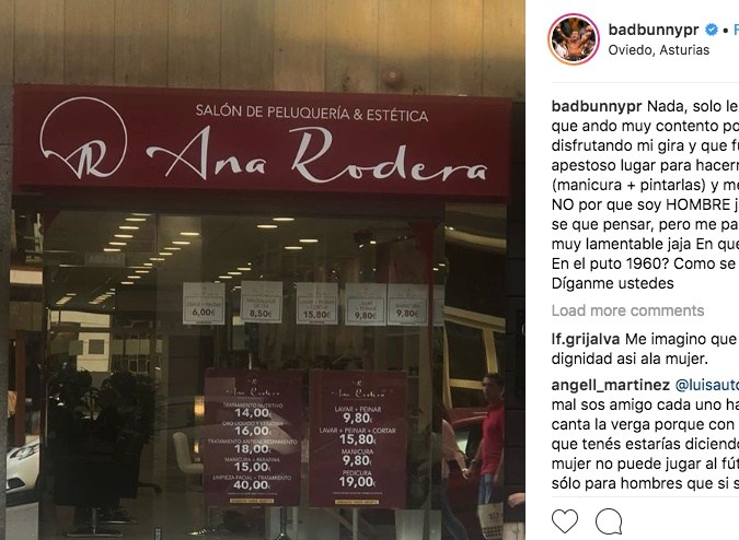 While on tour in Europe, Bad Bunny went to the Ana Rodera salon in Oviedo, Spain to get his nails done, but was refused service. On Monday, he recounted the incident on Twitter in Spanish. “I just wanted to tell you all that I went to this shitty place to get my nails done (manicure + color) and they told me NO because I’m a MAN hahaha. I don’t know what to think, but it seems very very very unfortunate haha. What year is it? Fucking 1960? What do you call this?”