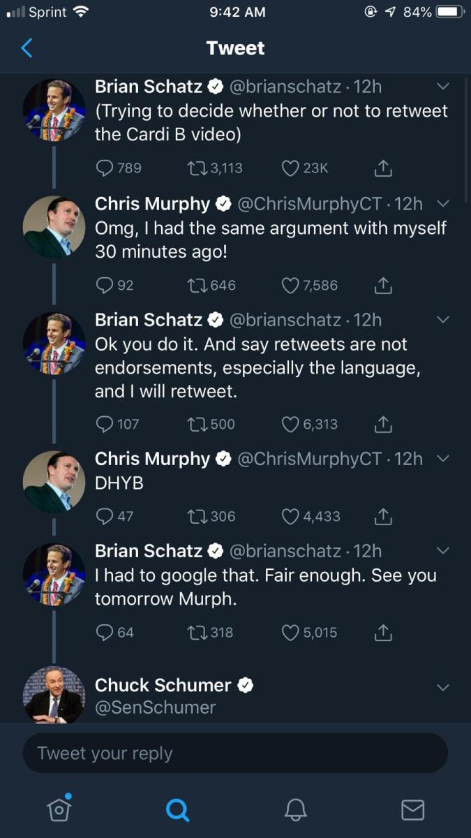 “(Trying to decide whether or not to retweet the Cardi B video),” wrote Senator Brian Schatz of Hawaii. “Omg, I had the same argument with myself 30 minutes ago!” Senator Chris Murphy replied. “Ok you do it. And say retweets are not endorsements, especially the language, and I will retweet,” Schatz responded. “DHYB,” Murphy wrote, using the abbreviation for “Don’t hold your breath.” “I had to google that. Fair enough,” Schatz said. “See you tomorrow Murph.”