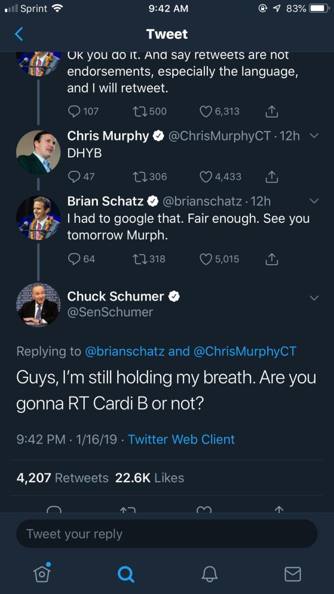 Even Senator Chuck Schumer joined the Twitter conversation. “Guys, I’m still holding my breath. Are you gonna RT Cardi B or not?” he asked.