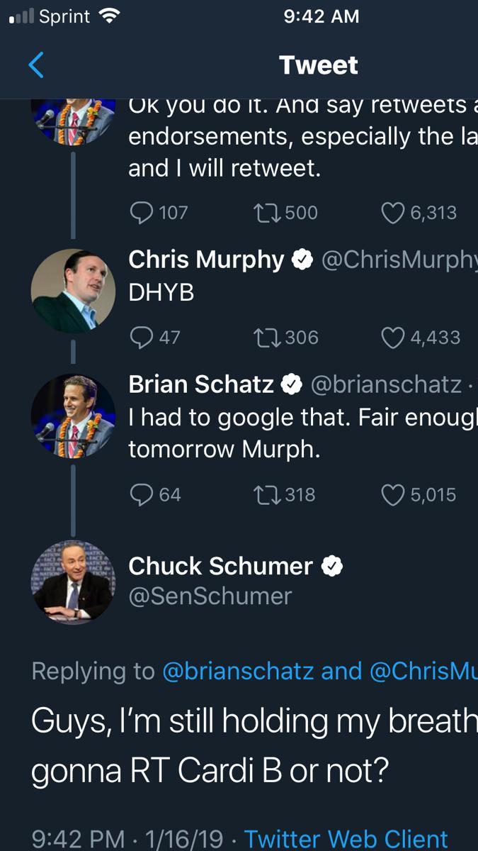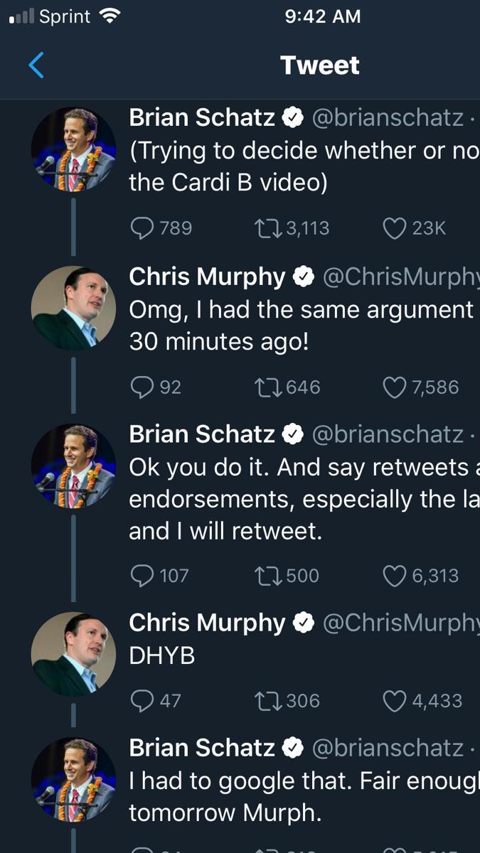 “(Trying to decide whether or not to retweet the Cardi B video),” wrote Senator Brian Schatz of Hawaii. “Omg, I had the same argument with myself 30 minutes ago!” Senator Chris Murphy replied. “Ok you do it. And say retweets are not endorsements, especially the language, and I will retweet,” Schatz responded. “DHYB,” Murphy wrote, using the abbreviation for “Don’t hold your breath.” “I had to google that. Fair enough,” Schatz said. “See you tomorrow Murph.”