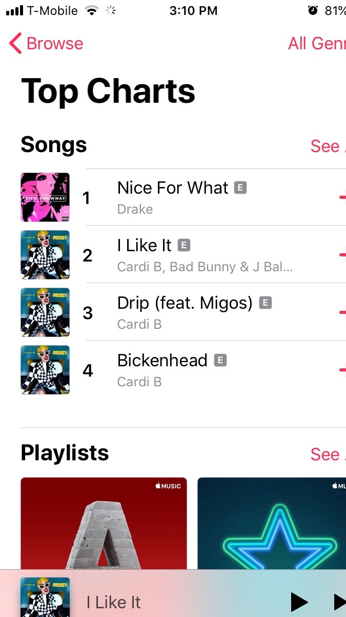 Some fans seem to agree the moment is major: today, representatives from both Apple Music and Spotify confirm that “I Like It” is currently the most streamed song from Invasion of Privacy worldwide. It sits at no. 9 on the United States Top 50 chart on Spotify, no. 31 on the Global Top 50 Chart on Spotify, and takes the no. 2 spot on Apple Music’s U.S. chart, beating out the Migos link-up and recent single “Drip.”