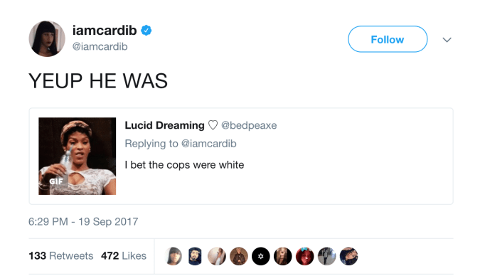On Twitter, a fan asked if the cop was white, to which Cardi replied, “YEUP HE WAS.”