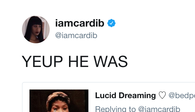 On Twitter, a fan asked if the cop was white, to which Cardi replied, “YEUP HE WAS.”