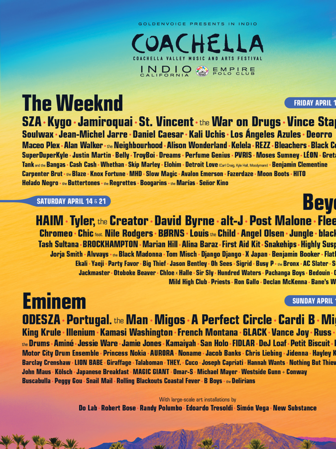 We’re only a couple days into 2018, and as expected, Coachella has announced the lineup for its 2018 edition. The mammoth two-weekend festival returns to its Empire Polo Club location in Indio, California, once again on April 13–15 and April 20–22. Queen Beyoncé is set to headline, after she was originally tapped to perform last year and dropped out because of her pregnancy. Joining her are The Weeknd and Eminem at the top of the lineup, plus 2017 favorites like SZA, St. Vincent, and Migos.