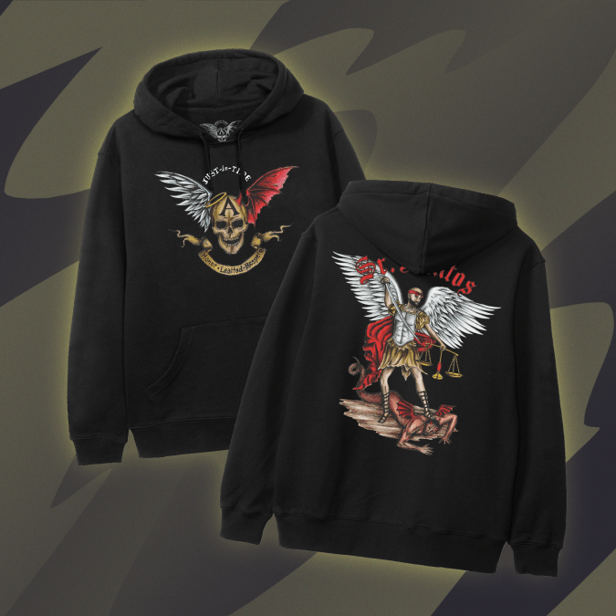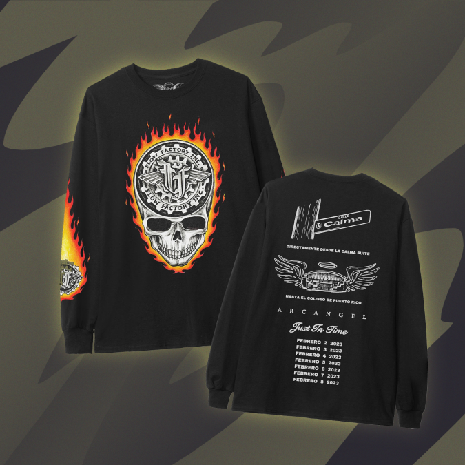The merch was also made to celebrate Arcángel’s latest album, Sr. Santos. One shirt features an illustration of Saint Michael the Archangel. Another long-sleeve shirt was inspired by Arcángel’s company Flow Factory with the logo inside of a burning skull.