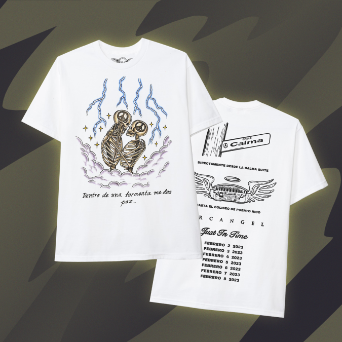 In Nov. 2021, Arcángel’s younger brother Justin was killed in a car accident by a reported drunk driver. Since then, Arcángel has kept Justin’s legacy alive through his music, and now with these upcoming Just In Time concerts and merch. One of the shirts features a horse jockey holding a banner that says “Justin’s Legacy.” Another shirt with the message “Pídeme La Bendición” features Arcángel with angel wings and the chest tattoo he got in honor of his late brother.