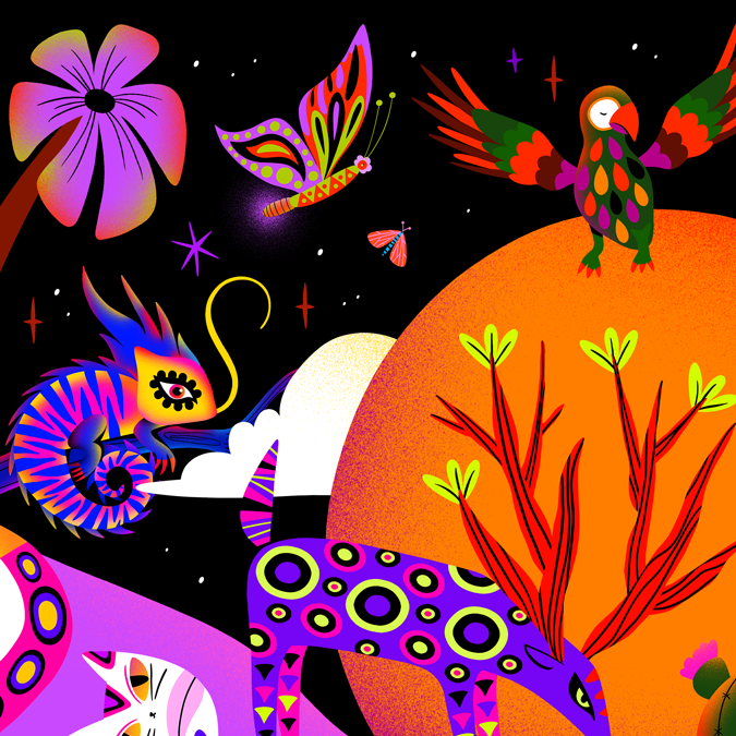 The musical project doesn’t only deliver tracks sung in Spanish. It also includes songs in Zapotec, Nahuatl, and Spanglish, showing some of the diversity among Mexican people. The cover art, created by a Mexican artist Yeti, also shows its innovation by illustrating different alebrijes to represent each artist and their personality.