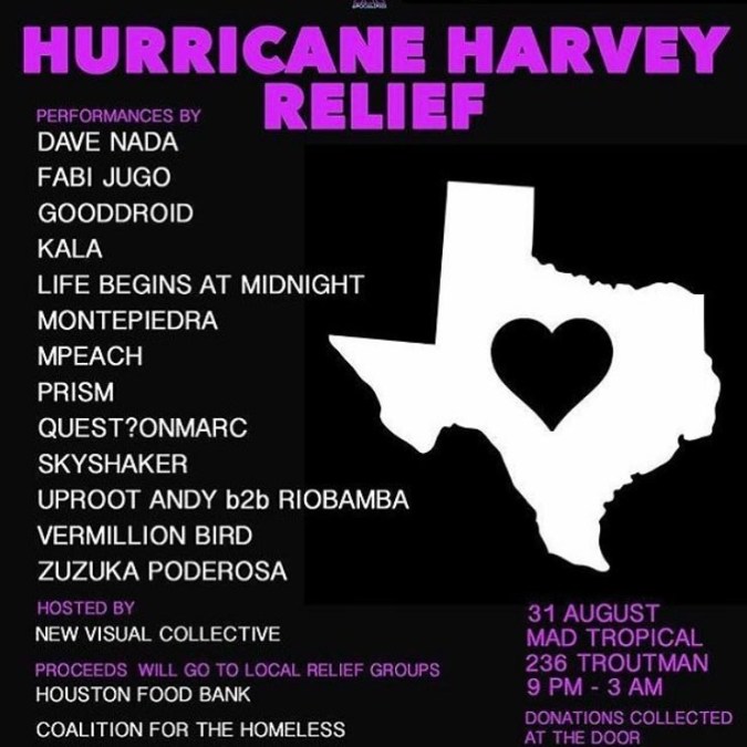 APOCALIPSIS’ Hurricane Harvey relief takes place tonight, August 31, at Brooklyn’s Mad Tropical from 9 p.m. to 3 a.m. For more info, head over to the Facebook event and check out the flyer below.
