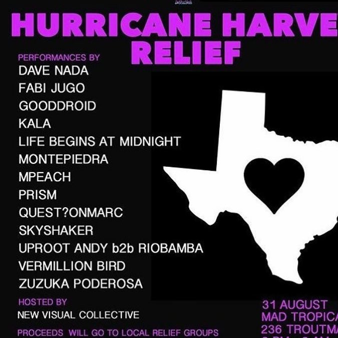APOCALIPSIS’ Hurricane Harvey relief takes place tonight, August 31, at Brooklyn’s Mad Tropical from 9 p.m. to 3 a.m. For more info, head over to the Facebook event and check out the flyer below.