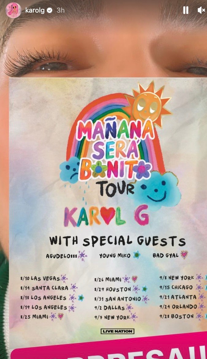 “Surprise,” Karol G announced via an Instagram story. The post featured a flyer showing the special guests’ names with the “MAMIII” singer smiling in the background.