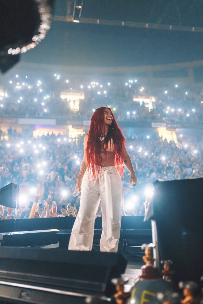 Karol G hit the stage for the first time with her new red hair on Saturday night (Aug. 20). The Colombian superstar was a surprise guest at Eladio Carrión’s sold-out concert in Puerto Rico.