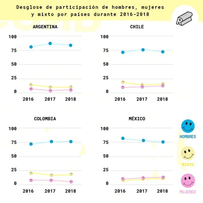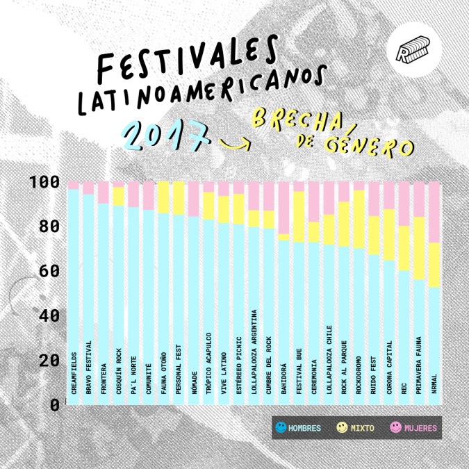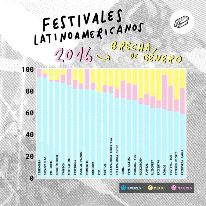 To provide some examples of what’s working and what’s not, Ruidosa identified the festivals that tend to have the most women performing (they know what they’re looking for: Ruidosa has been putting on their own festival for a few years now). They found that Colombia’s Estéreo Picnic and Mexico’s Vive Latino had the highest percentage of women, but with rates of 7 percent and 5.9 percent respectively, even those numbers are abysmal at best. Ruidosa also found that lineups in Chile, Colombia, and Mexico are slightly more inclusive, with 20 and 30 percent of musical acts led by women or including women. The lowest representation rates occurred at festivals in Argentina, where the number of women artists lingers around 14 percent.