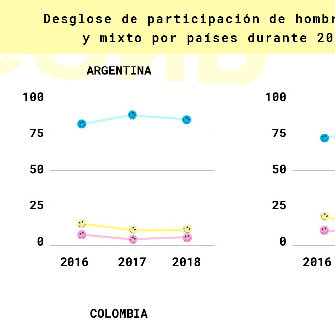 A new study released by the group shows that gender inclusivity at 66 relevant Latin American music festivals has barely made progress over the last three years. In 2016, only 9.1 percent of acts at these festivals were led by women; in 2018, that number grew to just 10.1 percent. Not one of the festival lineups managed to reach a 50-50 gender balance, and when Ruidosa calculated the averages between 2016 and 2018, they found that only 3 or less acts out of 10 are fronted by women or even made up of at least one woman.