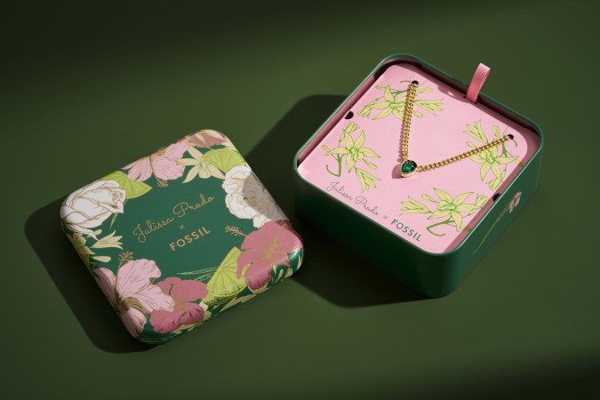 The collection includes a gold-tone brass necklace ($80) and a matching chain bracelet ($65) featuring an emerald green teardrop crystal. The accessories are packaged in an earthy, floral tin can specially designed by Prado. In a video on her Instagram page, she shared, “I wanted the design on the classic @Fossil tin box to represent my family’s garden that included roses, Mexican orchids, hibiscus flowers, and lime trees.”