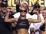 New York , United States - 29 April 2022; Amanda Serrano during the weigh-in, at Hulu Theatre at Madison Square Garden, ahead of her undisputed lightweight championship fight with Katie Taylor, on Saturday night at Madison Square Garden in New York, USA. (Photo By Stephen McCarthy/Sportsfile via Getty Images)