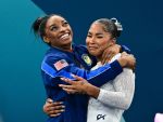 Jordan Chiles, of the United States, celebrates after performing on the uneven bars during the women's artistic gymnastics team finals round at Bercy Arena at the 2024 Summer Olympics, Tuesday, July 30, 2024, in Paris, France. (AP Photo/Natacha Pisarenko)