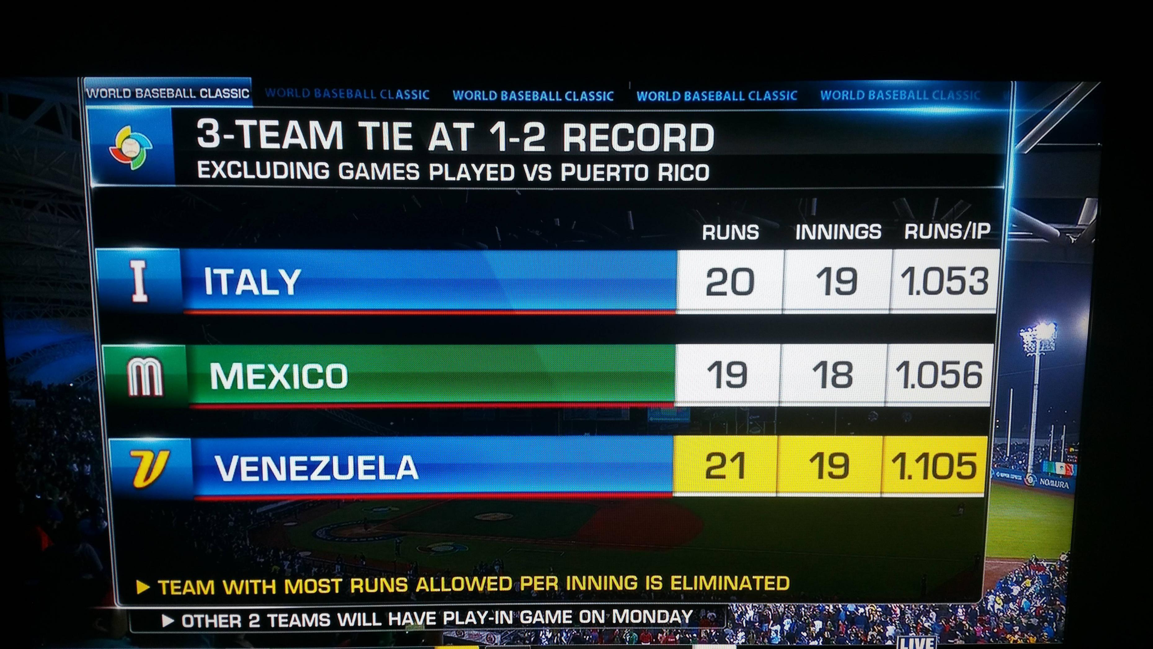 While that seems simple in theory to understand (you take the amount of runs scored and divide it by innings), Mexico’s 10-9 loss to Italy on Saturday night messed everything up. Because the Italians walked off in the 9th inning with the victory before any outs were recorded, it technically does not count towards Mexico’s “defensive inning” count, while the runs scored by Italy do count.